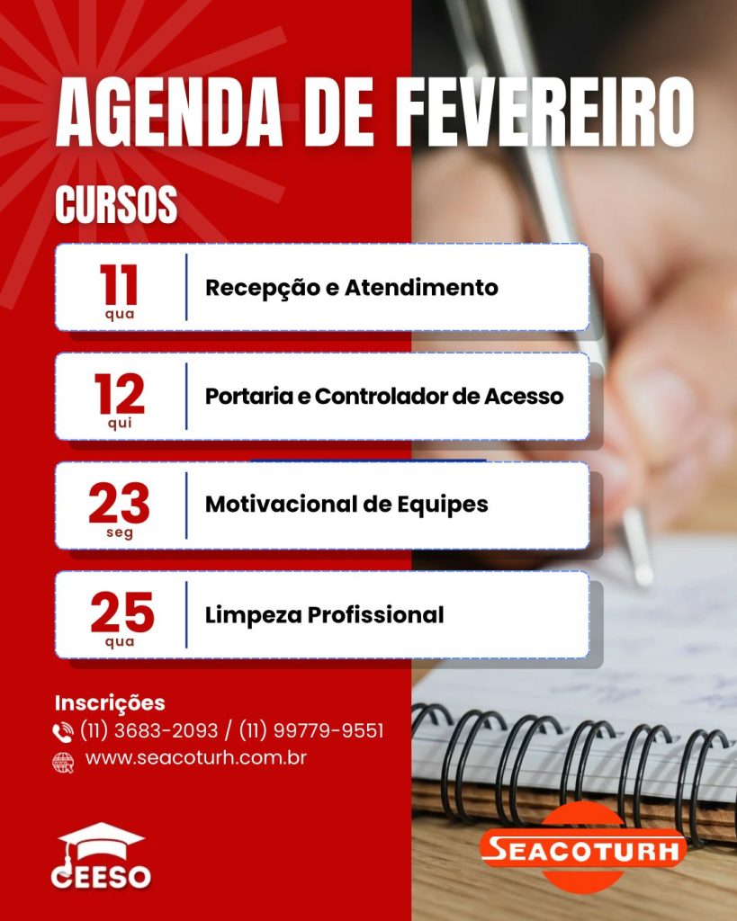 O SEACOTURH, por meio do CEESO (Centro de Especialização Seacoturh Osasco), preparou uma programação de cursos totalmente gratuitos, abertos para todos os interessados inclusive quem ainda não é associado!