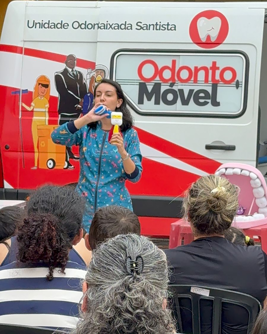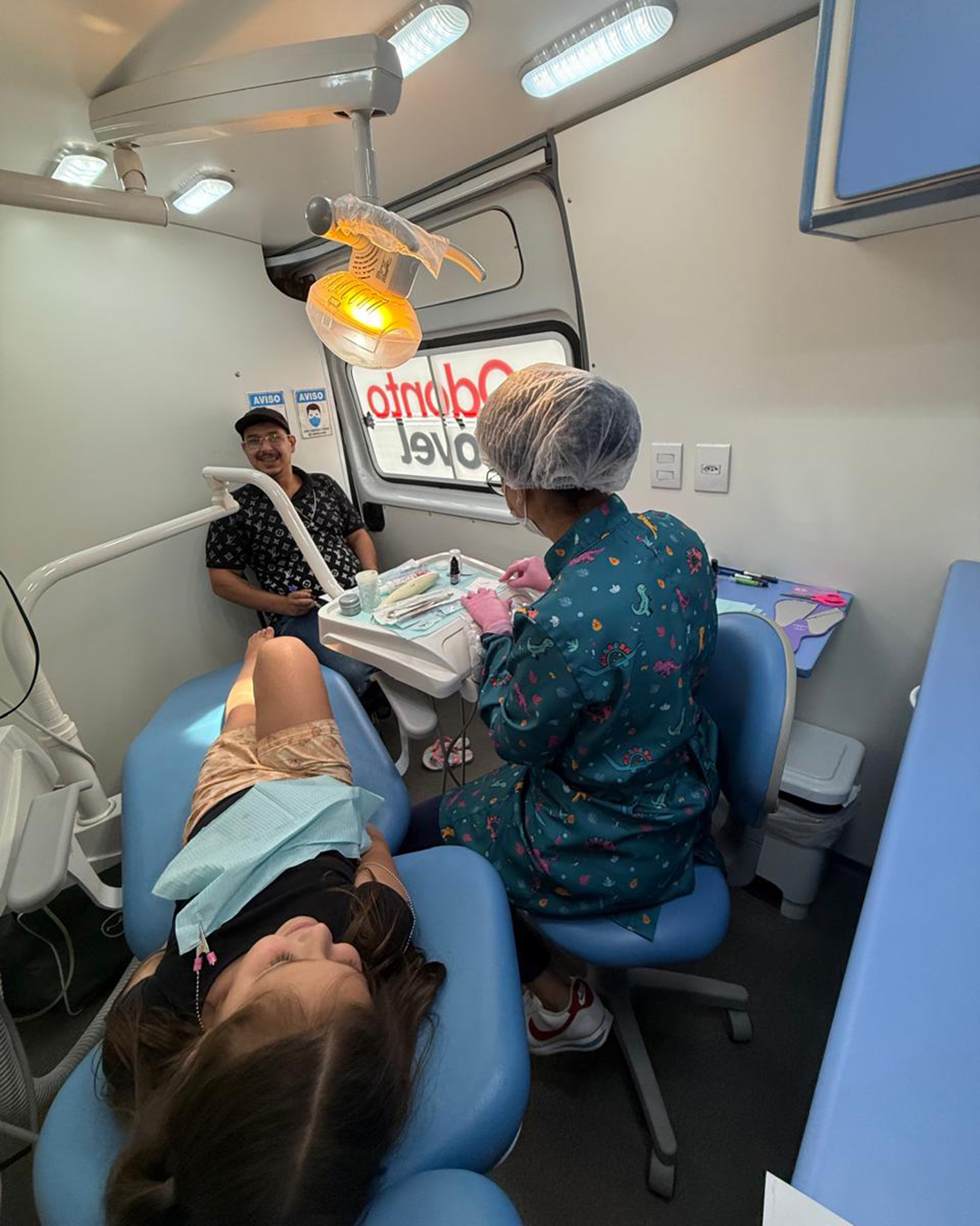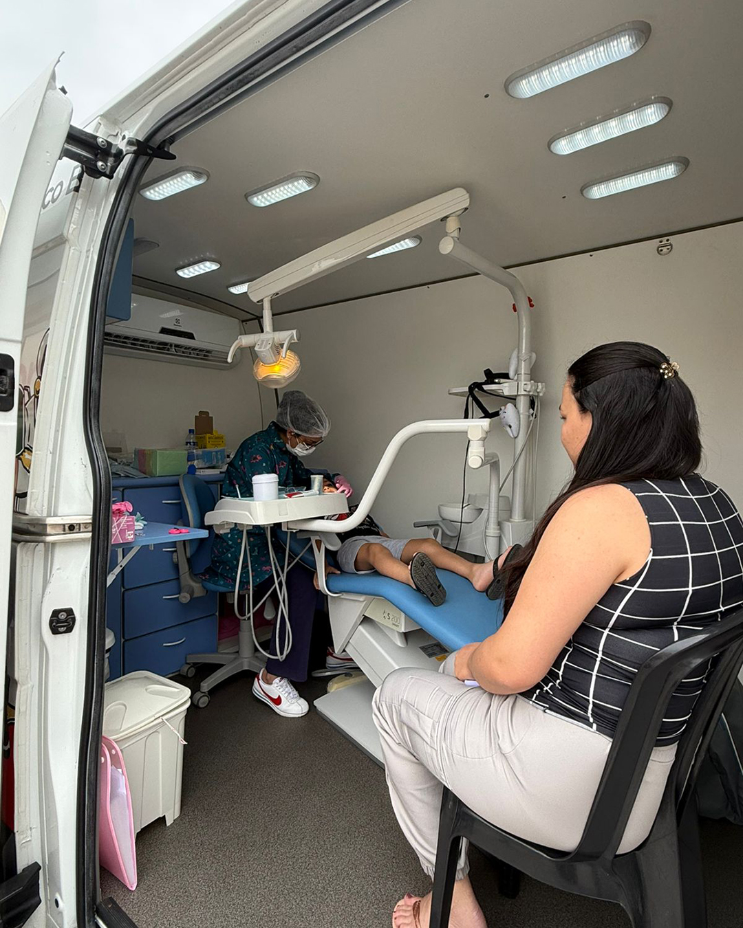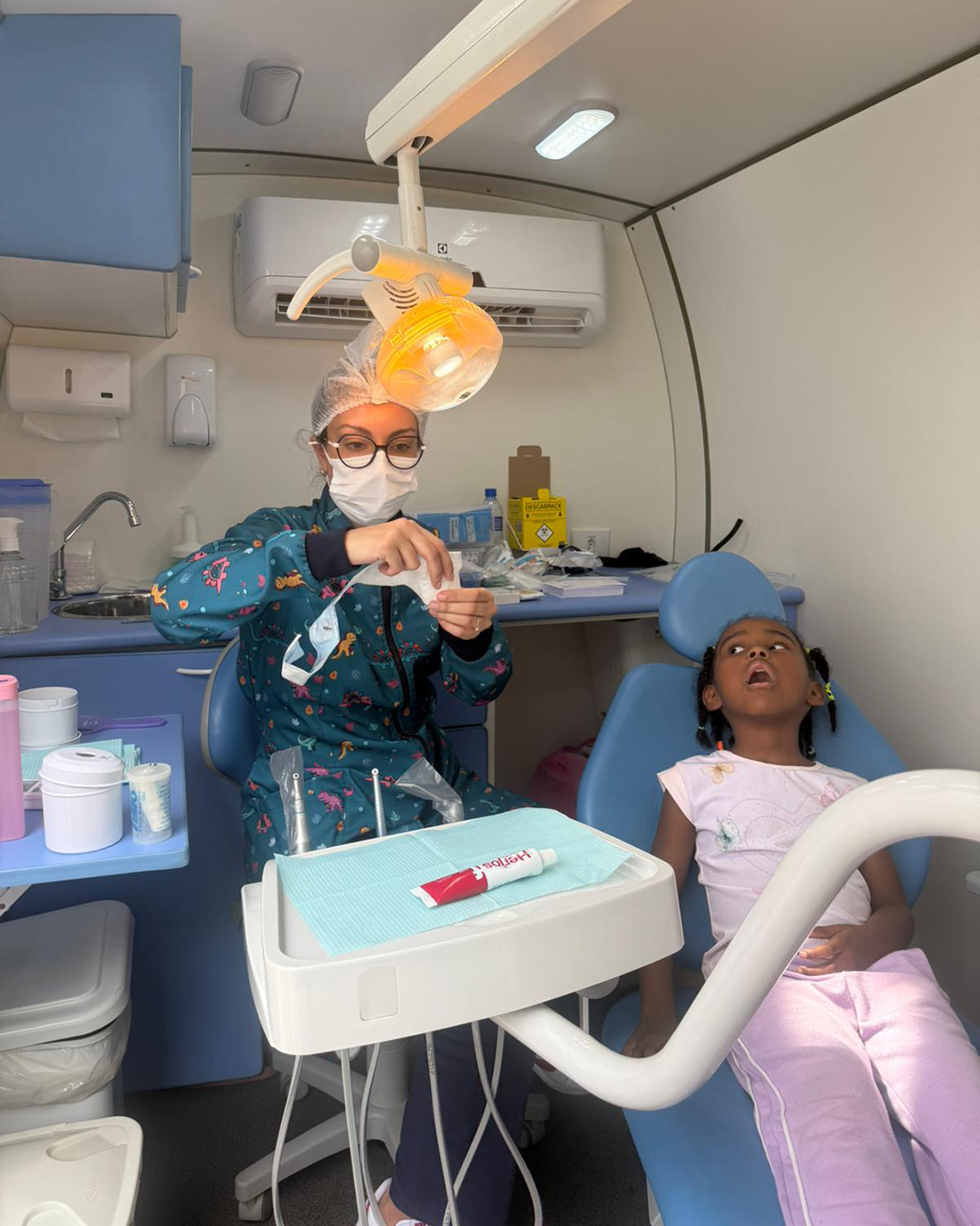 Durante o dia, dezenas de crianças foram atendidas na unidade móvel e, juntamente com as mães, receberam orientações, de forma lúdica, sobre a importância da prevenção e dos cuidados com a saúde bucal.