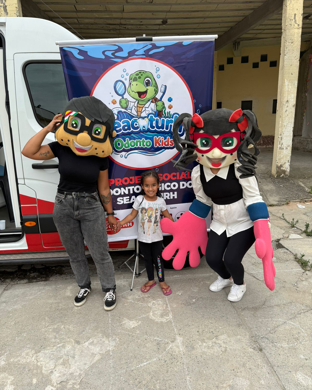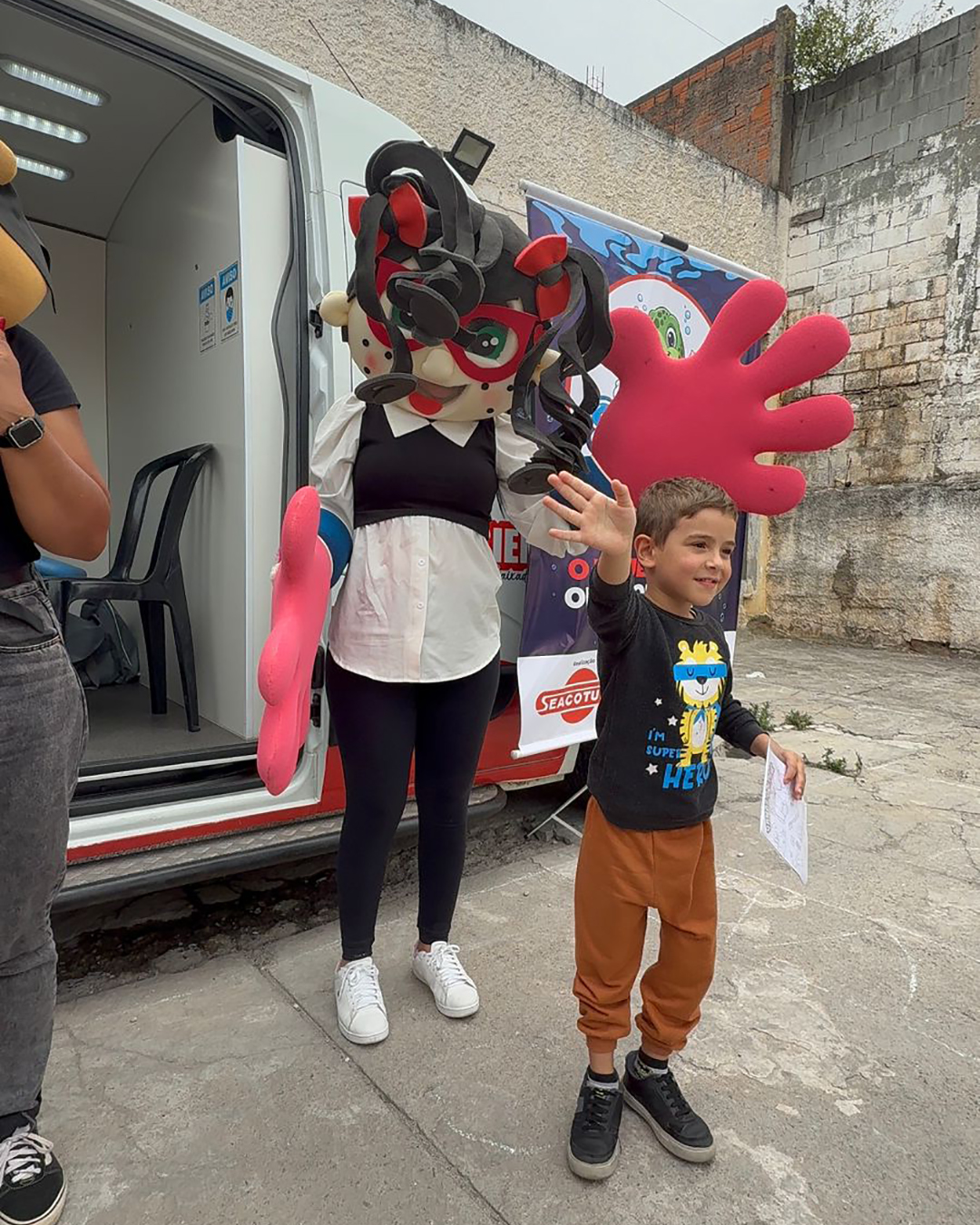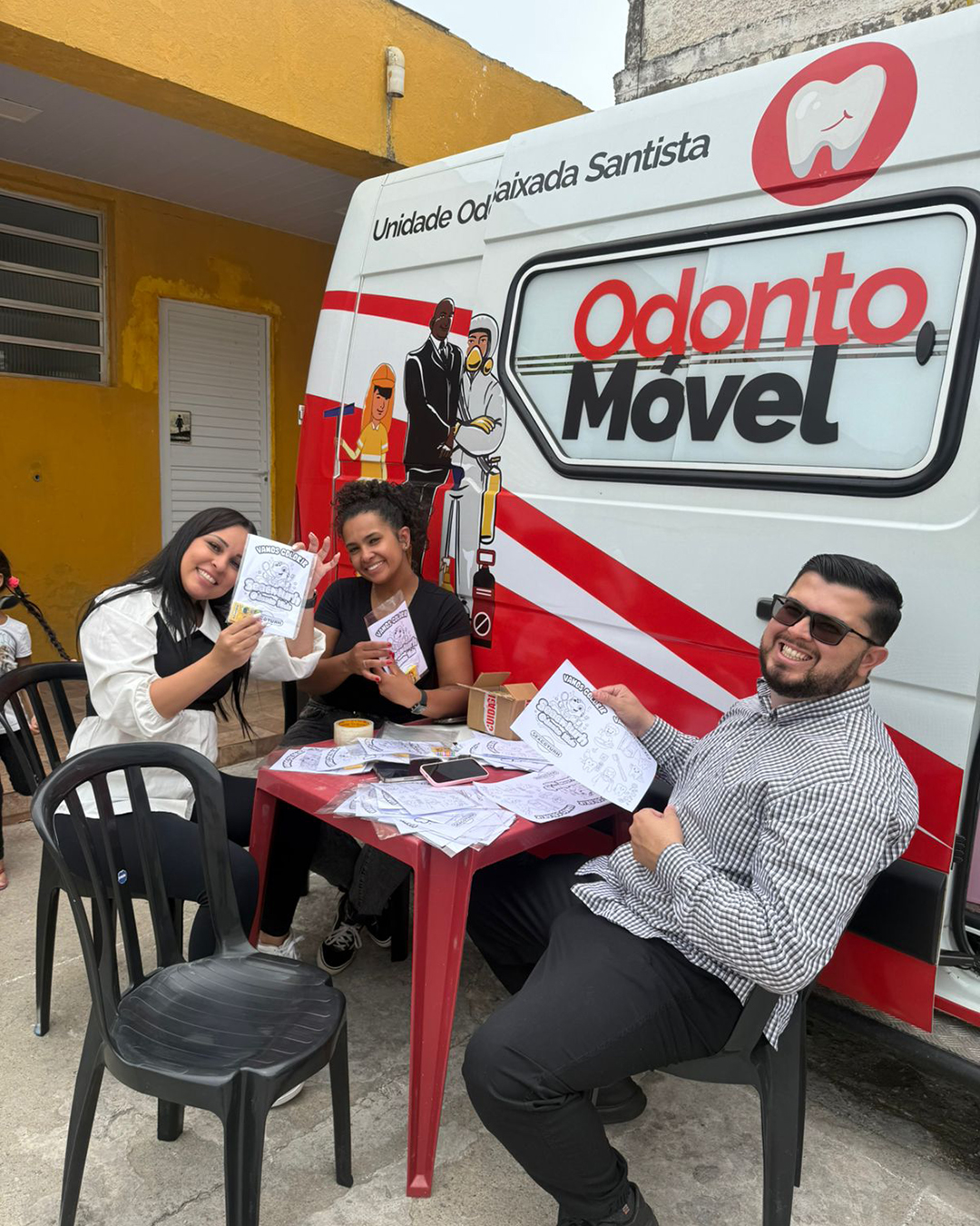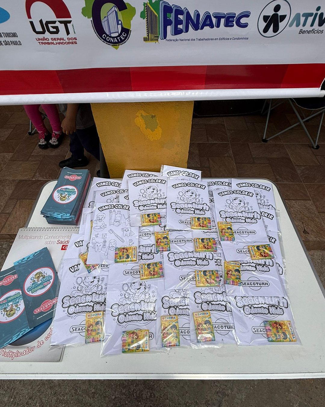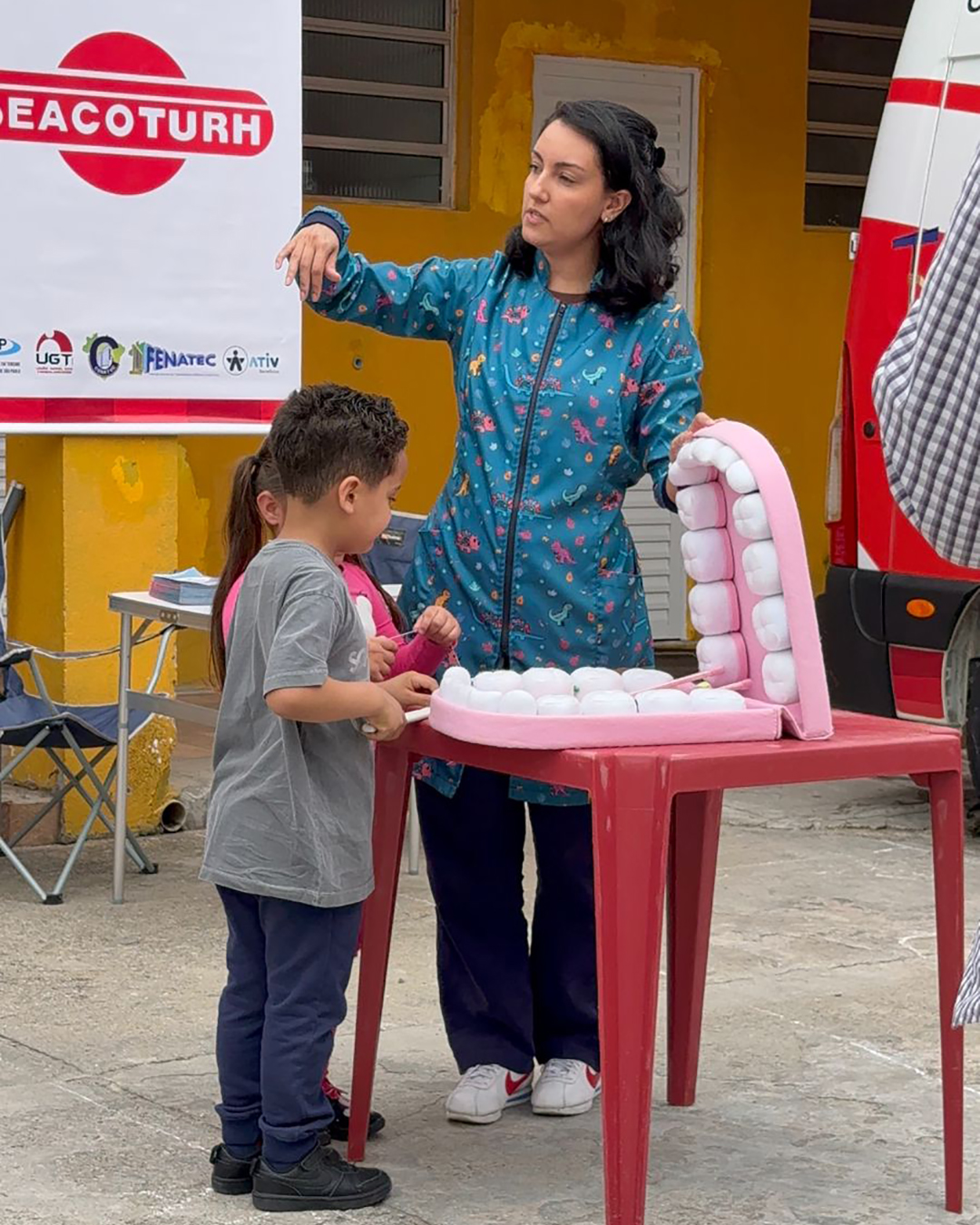 Utilizando a van Odontomóvel, emprestada pelo Siemaco Baixada Santista, a equipe do SEACOTURH promoveu atendimentos odontopediátricos, orientações sobre higiene bucal e atividades educativas de prevenção. A iniciativa faz parte de um conjunto de ações sociais que o sindicato está desenvolvendo para aproximar o movimento sindical da comunidade, mostrando que o trabalho do sindicato vai muito além da defesa de direitos trabalhistas.