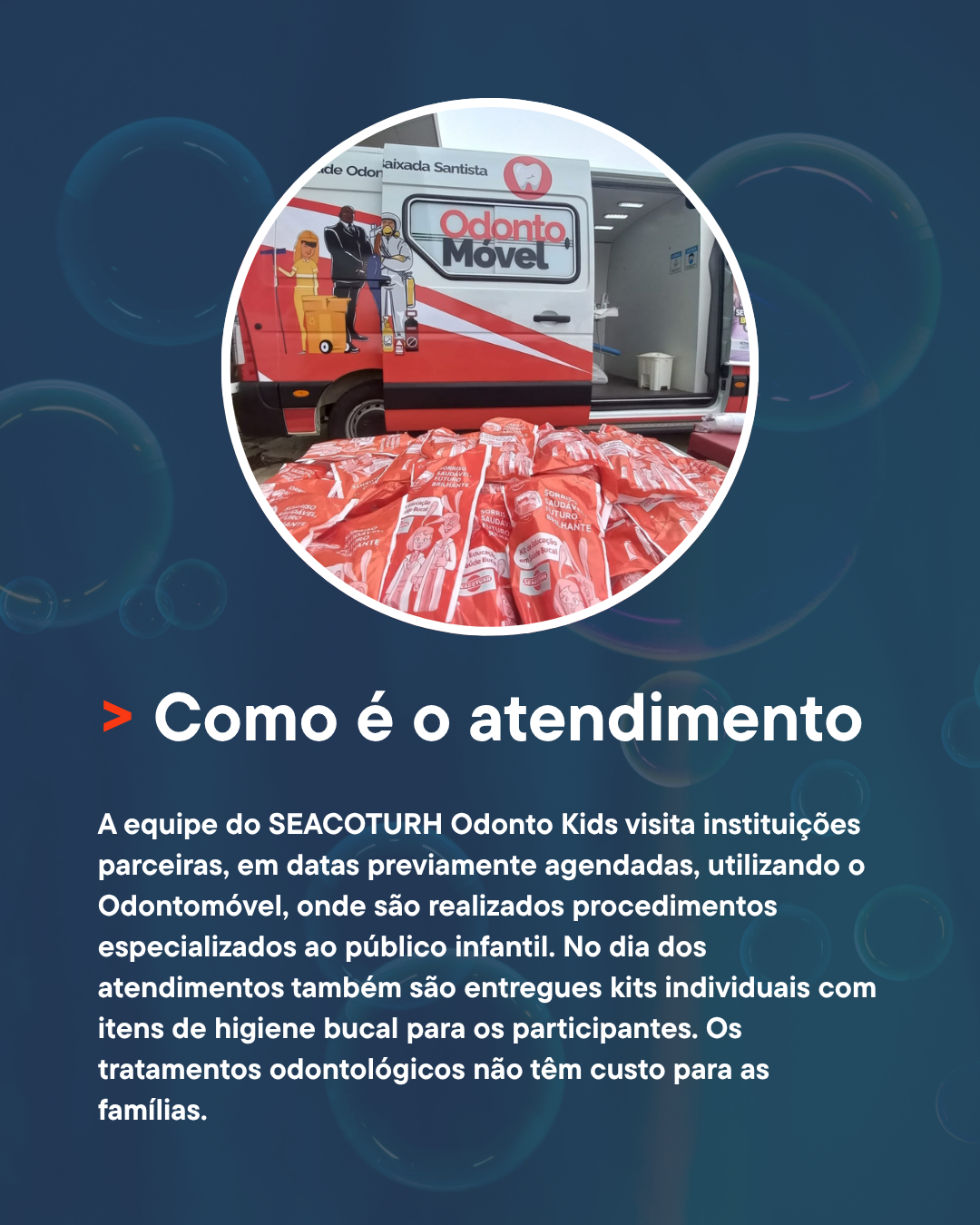Por meio do Odontomóvel, uma van com estrutura de clínica, o projeto irá levar, de forma itinerante, cuidados odontológicos a crianças atendidas por entidades do terceiro setor, realizando procedimentos especializados ao público infantil.